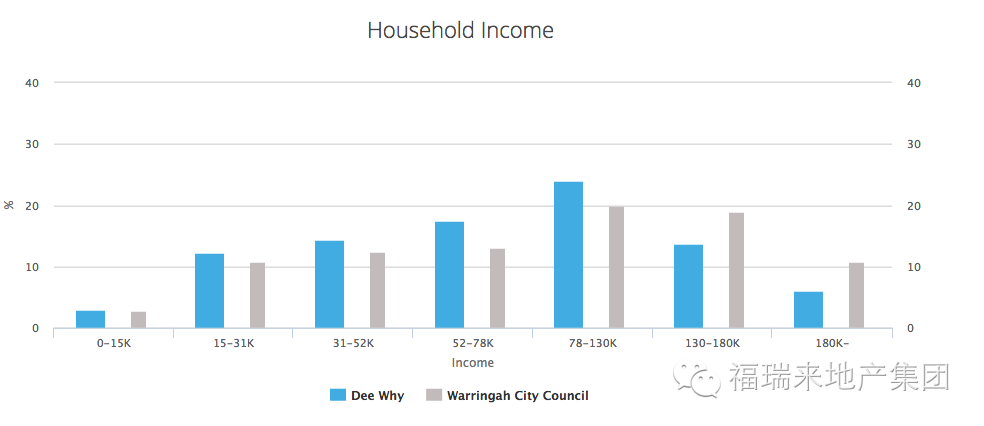 区内约两成家庭的全年收入介乎4.1万澳元至6.2万澳元之间,比率是各收入组别中最高,而全年收入超过13万澳元的家庭则占12%左右。
