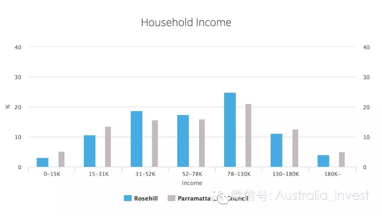 Rosehill有超过五成的高收入人群,年收入在5 -18万澳币以上。超过一半的居民是中高收入的经理及各种专业人士。