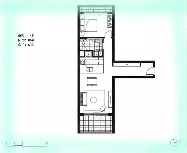 6、户型方正,东北朝向,阳光足。厨房带料理台。面积超大97平外加58平私人天井花园。