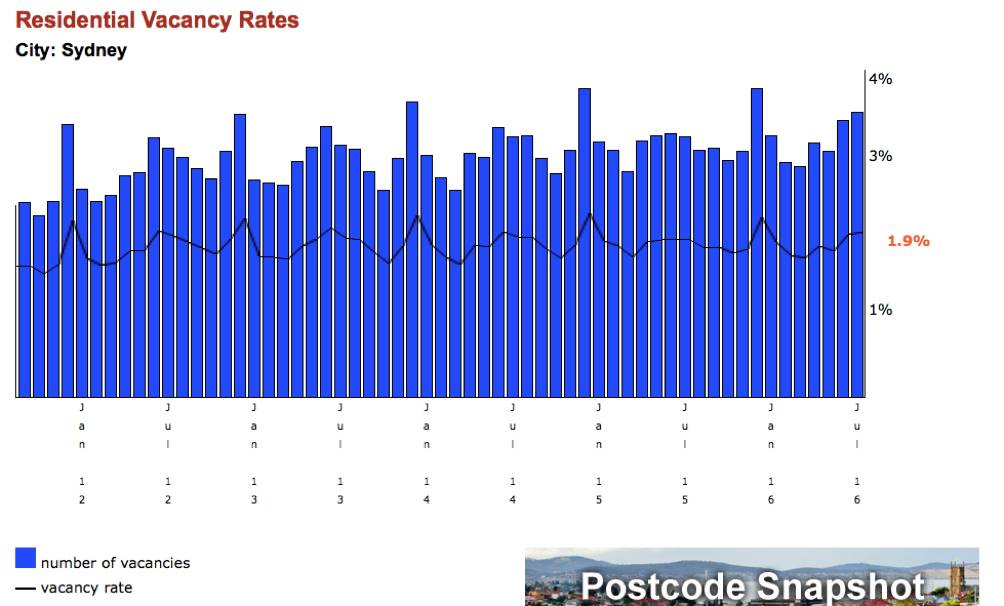 2016年7月数据为1.9%,悉尼的空置率一直在1%-2%之间,有些热门地区甚至在1%以下,这说明悉尼总体上100套房子只有不到2套是空置的。
