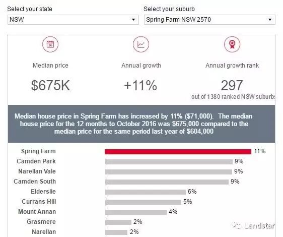 再看和Spring Farm同属于Camden Council的Oran Park,去年的房价年涨幅达到24.5%,位列新南威尔士州第三名!显然Spring Farm还远远没有兑现它的增值潜力,人口持续增长将使Spring Farm的前景一片光明!